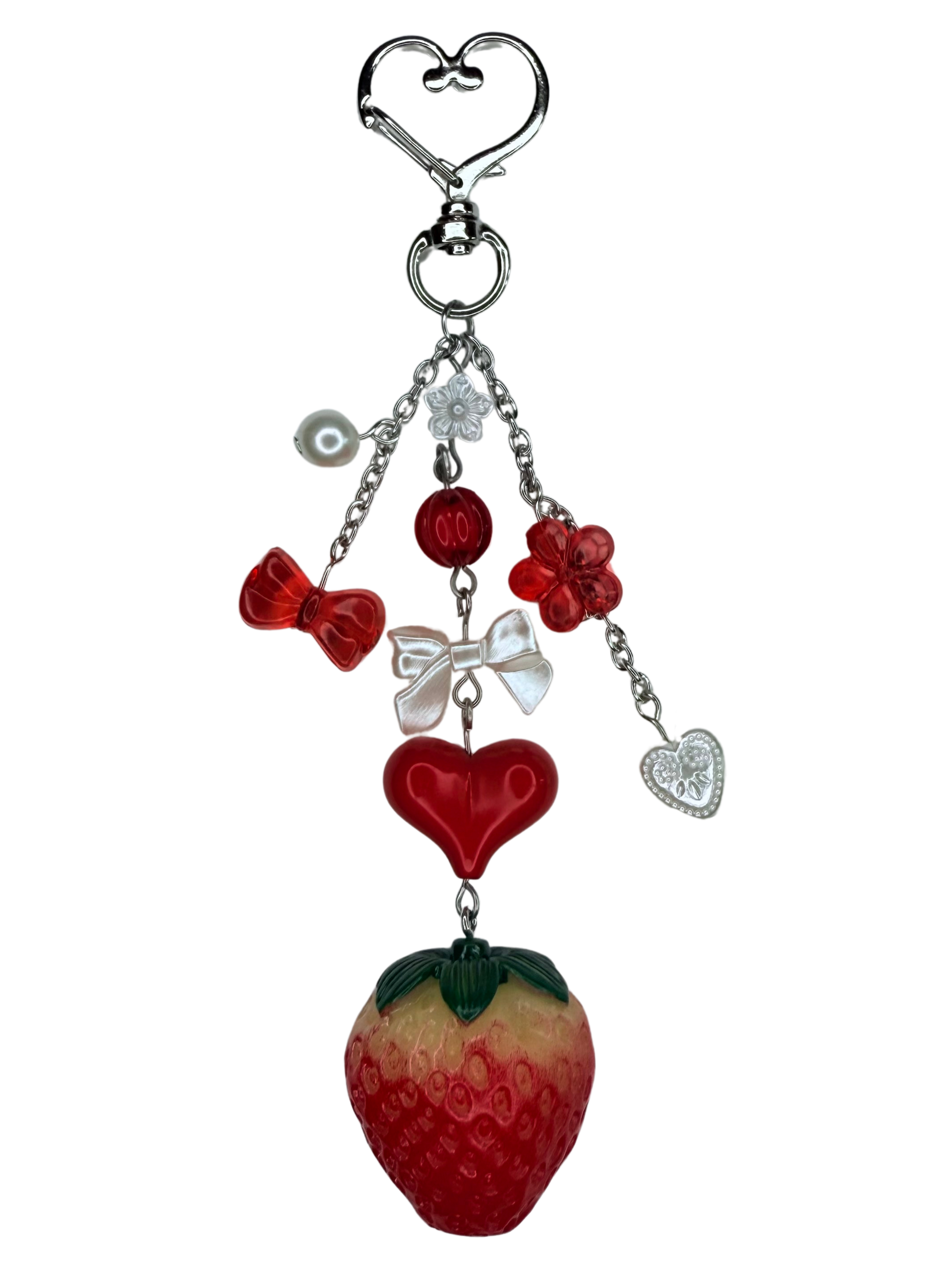 Strawberry themed keychain with a variation of bead detailing and strawberry center piece.