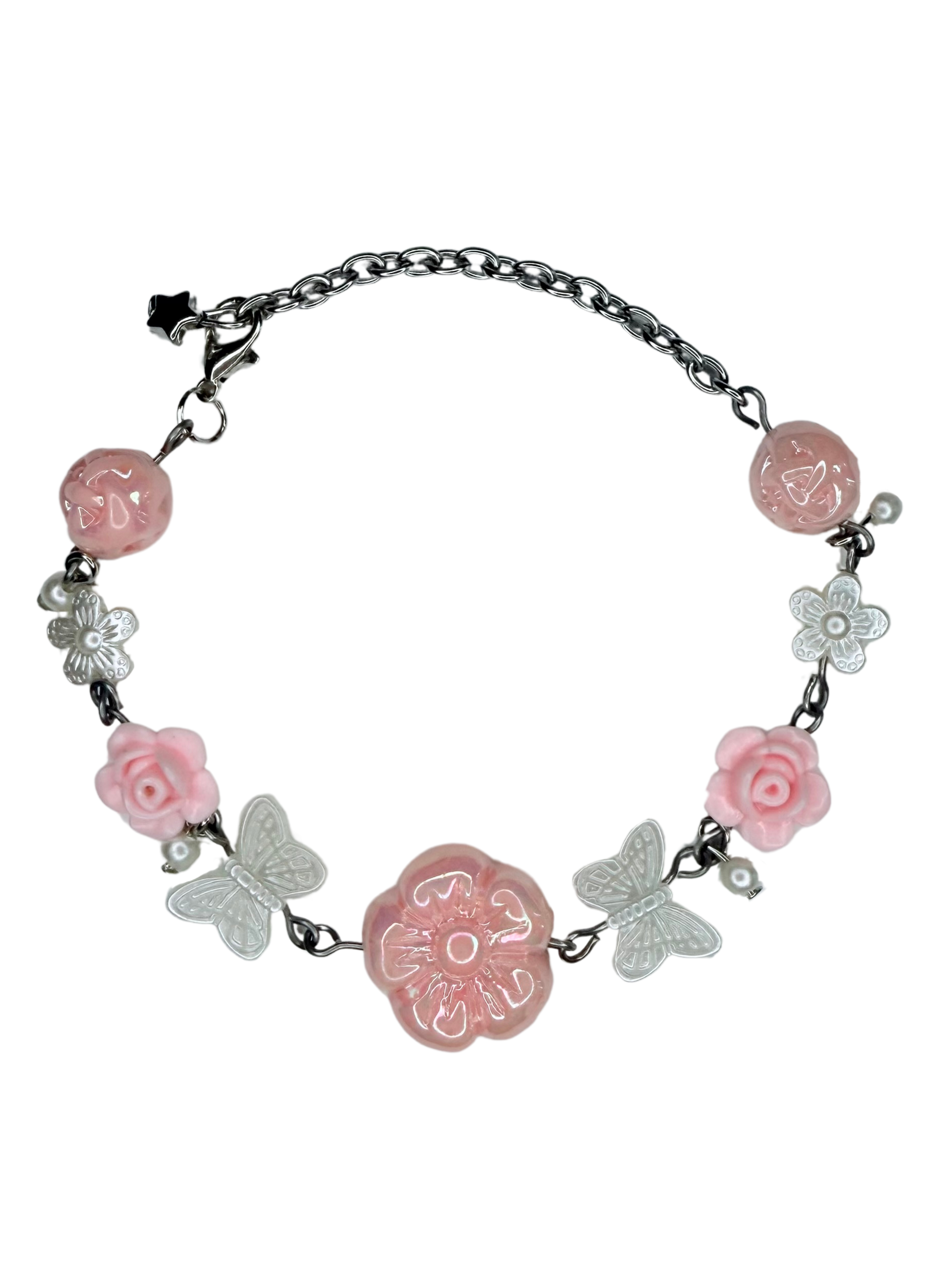 Pink themed bracelet with a variation of bead detailing and a Pink Flower center piece.
