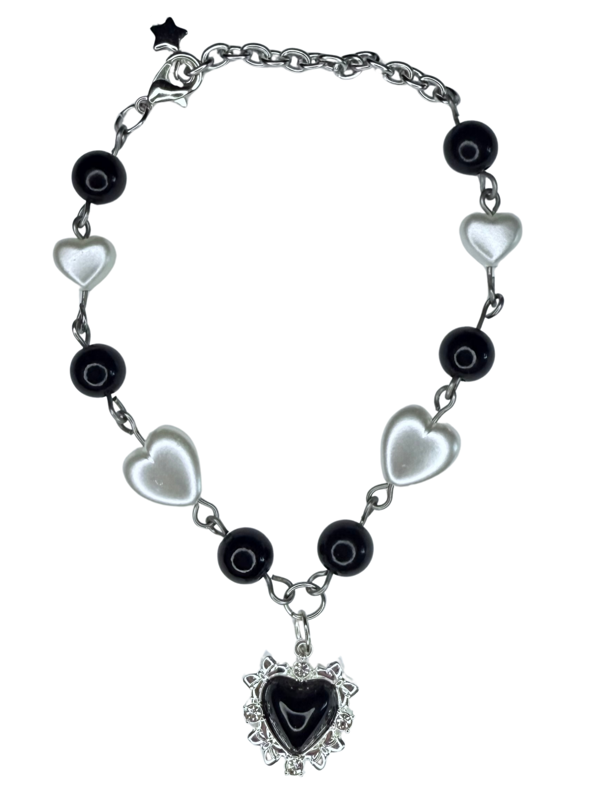 Black and Pearl Heart Themed Bracelet with a Variation of Bead Detailing.
