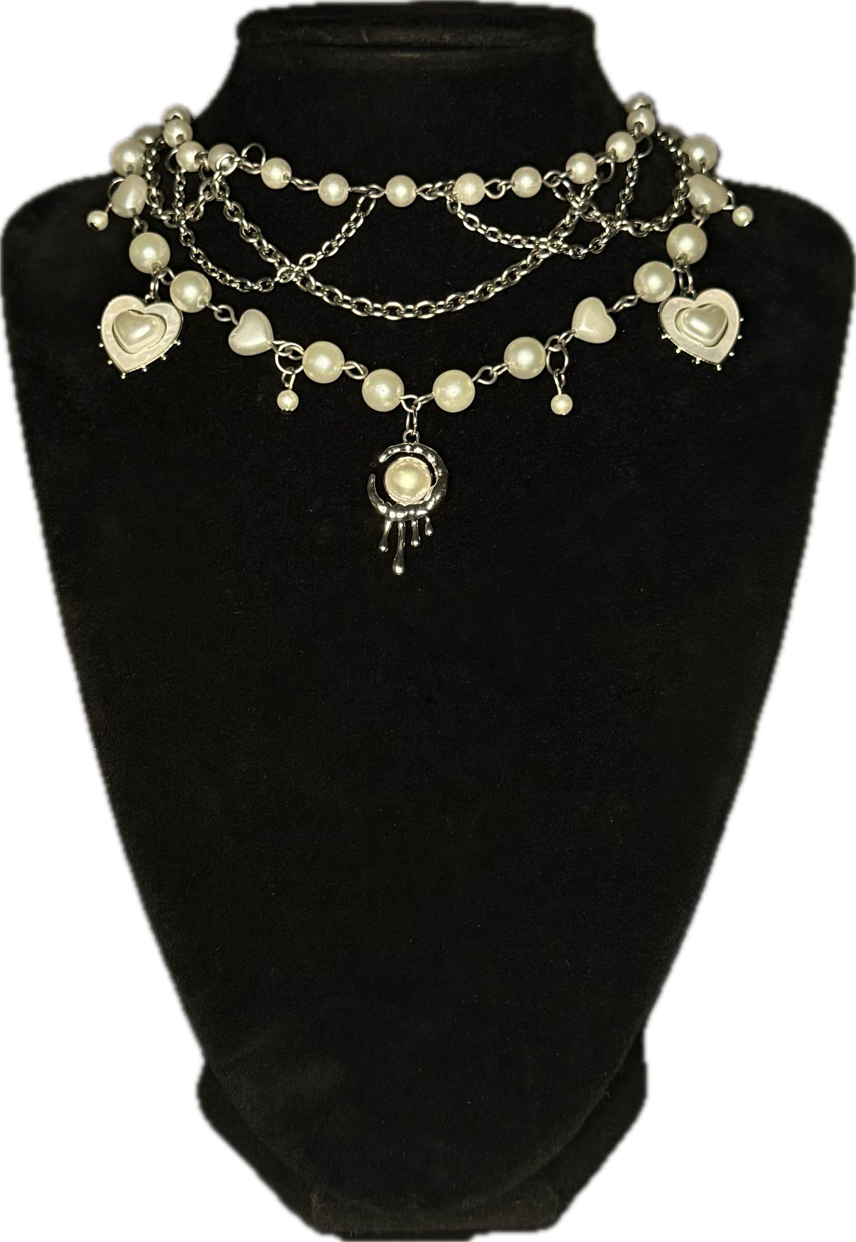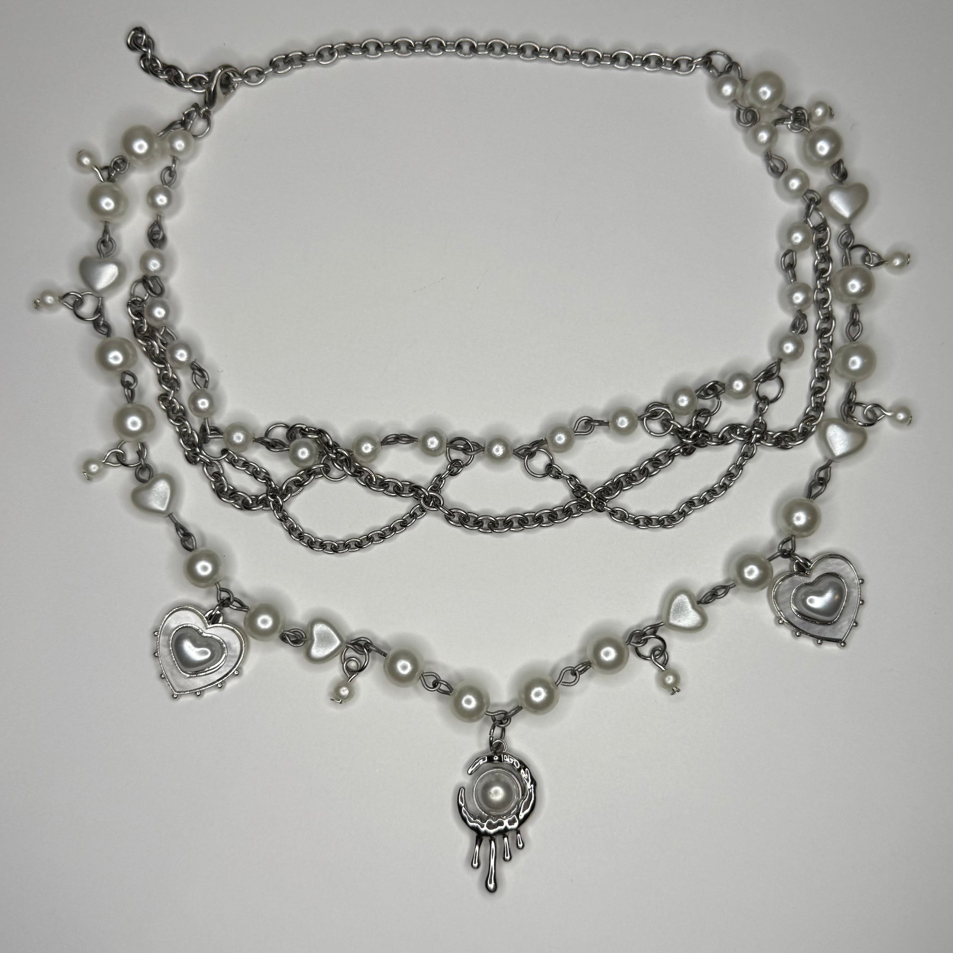 Double- Layered Pearl Necklace with Silver Chain Detailing.