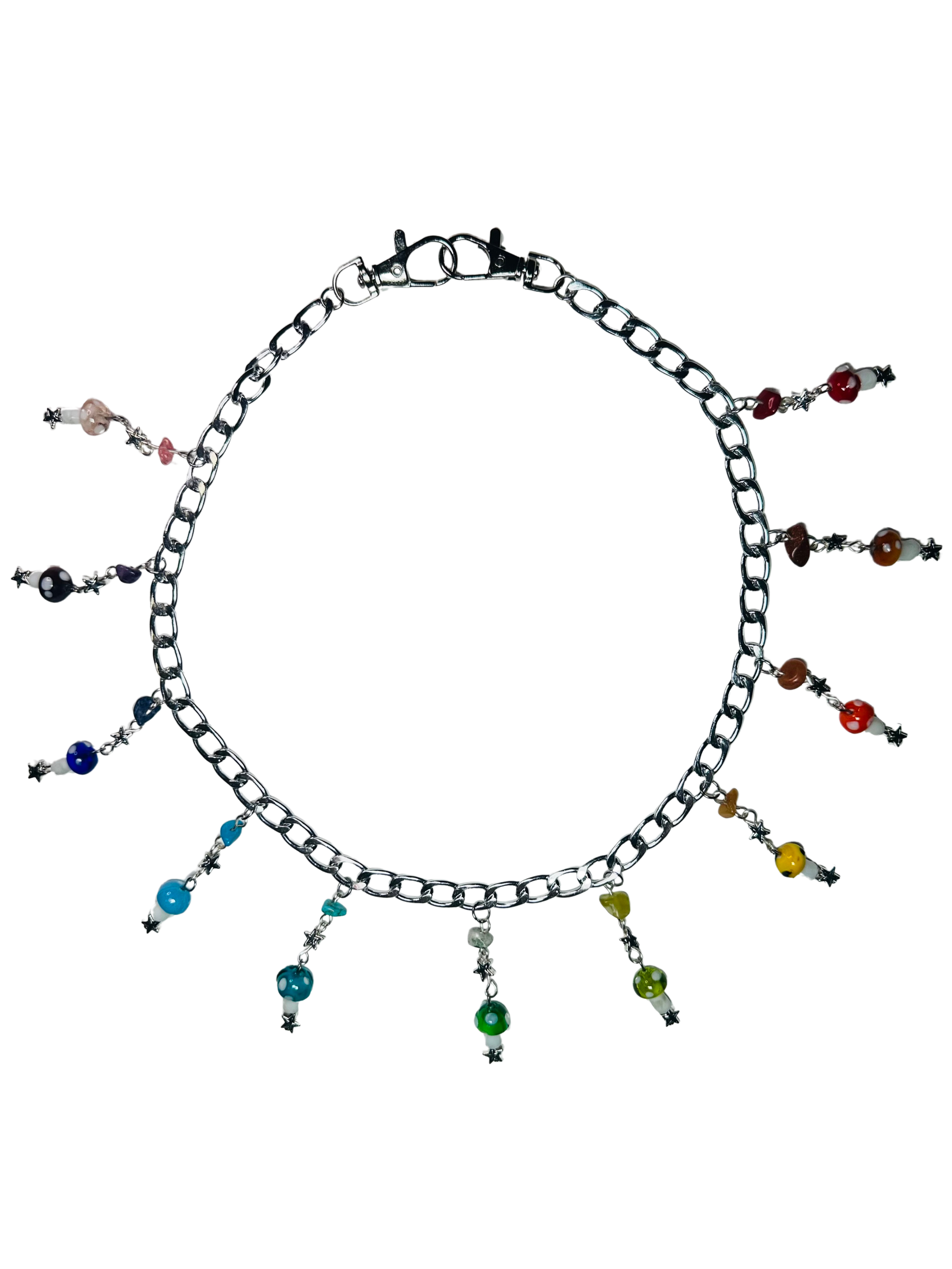 Rainbow Wallet Chain with a Variation of Glass Mushroom and Crystal Bead Detailing.
