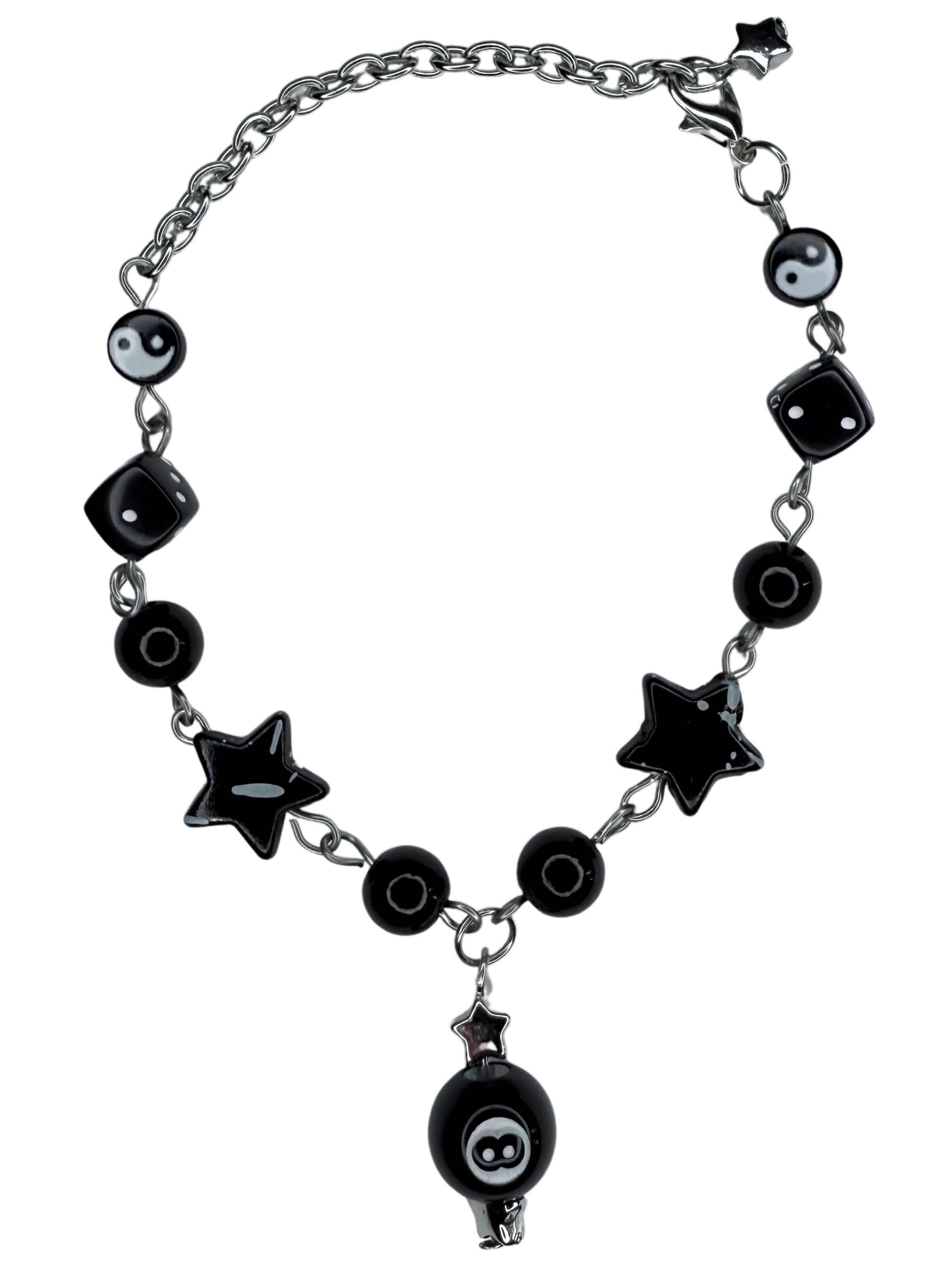 Black themed bracelet with a variation of bead detailing and 8-ball center piece.