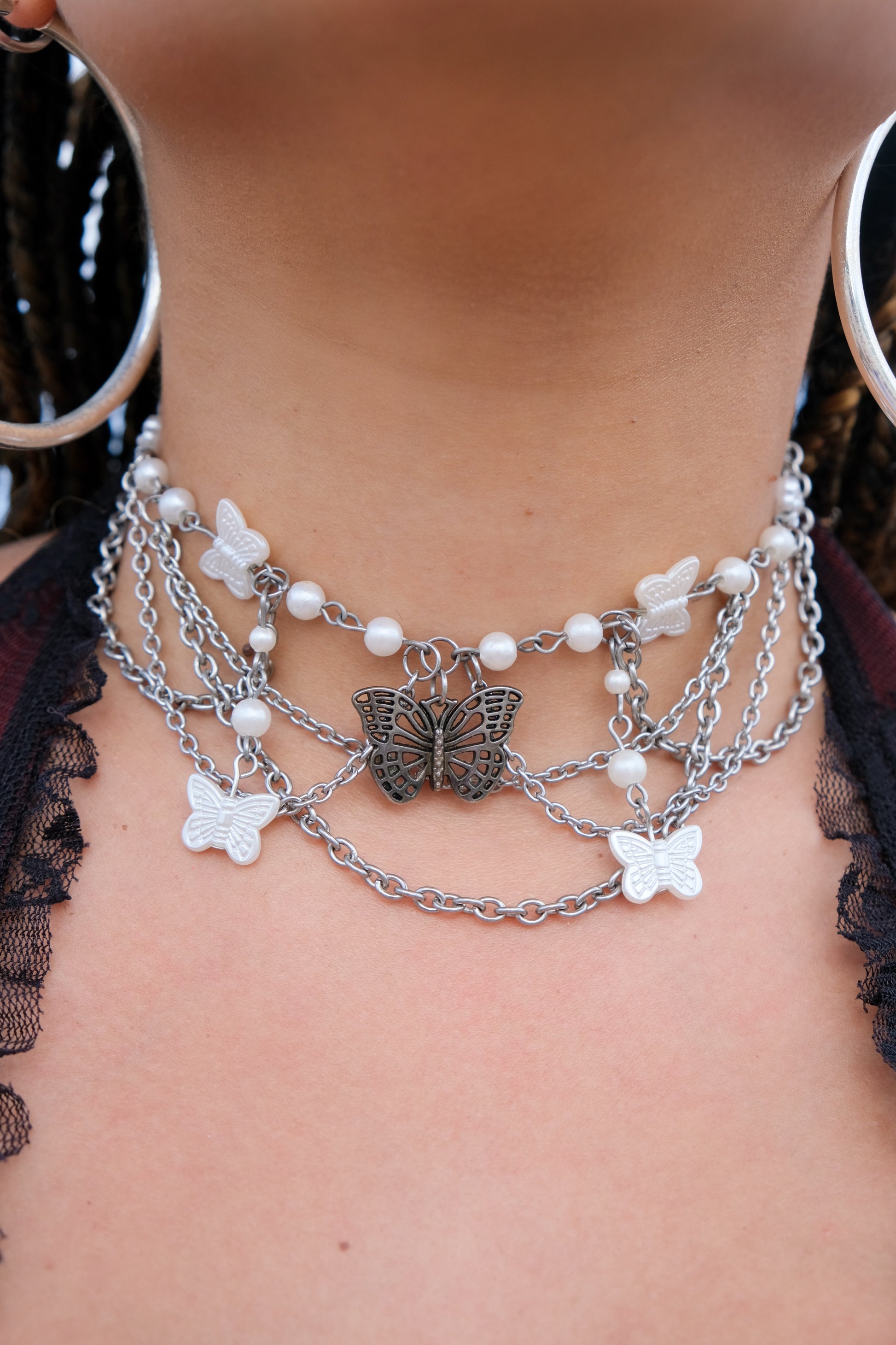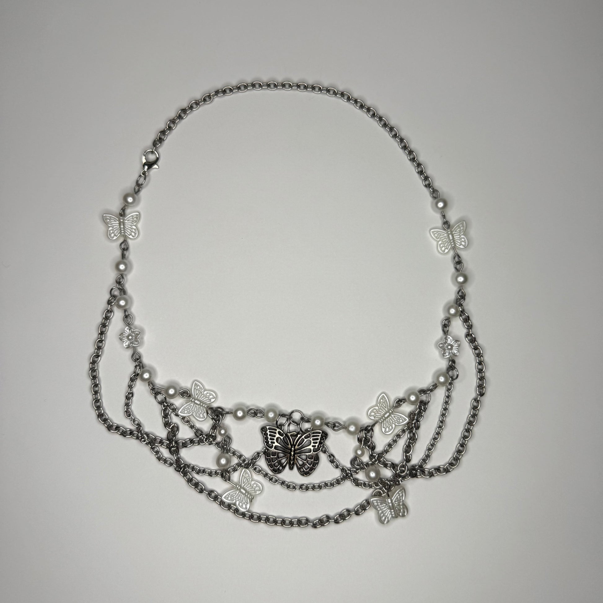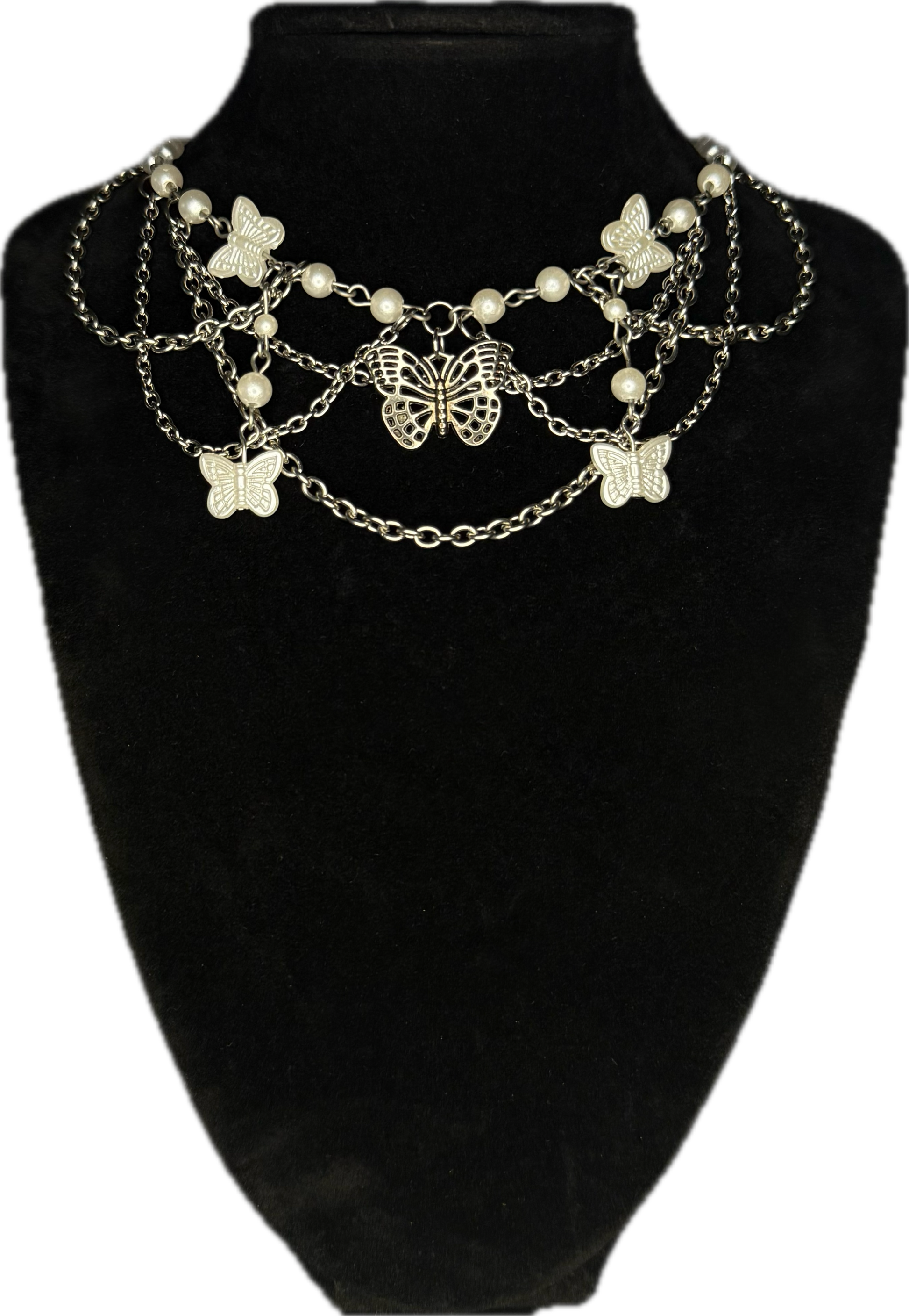 Pearl Butterfly Necklace with Silver Chain Detailing.